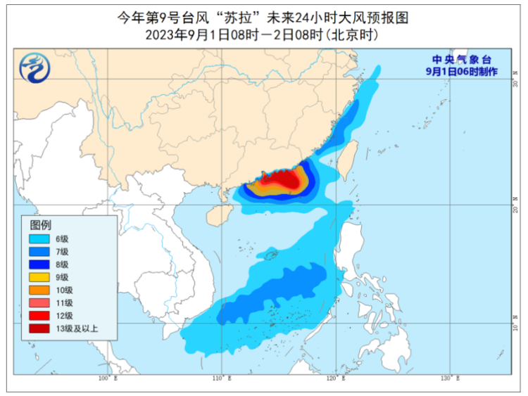 受“苏拉”和南下冷空气共同影响,未来三天,南海北部海域、北部湾、琼州海峡将有7~9级、阵风10~11级的大风,南海北部的部分海域、广东沿岸海域风力可达10~12级、阵风13~14级,台风“苏拉”中心经过的附近海域风力可达13~16级、阵风17级及以上。福建南部、广东大部、广西东南部等地有大到暴雨,其中福建东南部、广东中南部、广西东南部有大暴雨,广东南部沿海局地有特大暴雨。