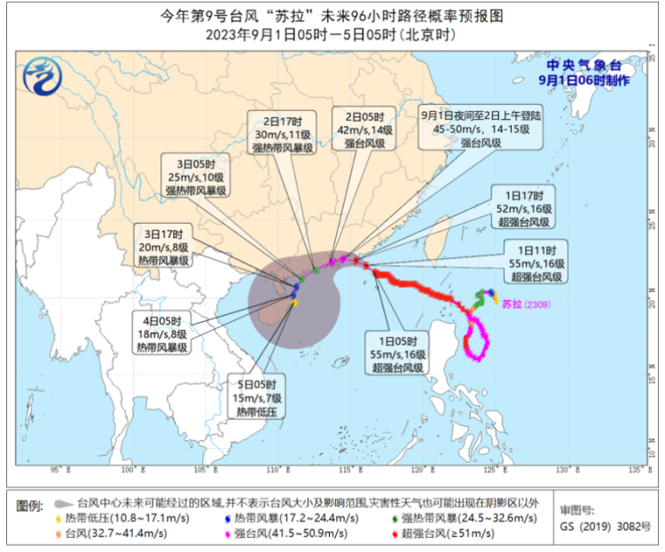 今年第9号台风“苏拉”(超强台风级)的中心今天(9月1日)早晨5点钟位于香港东偏南方大约270公里的南海东北部海面上,就是北纬21.7度、东经116.6度,中心附近最大风力有16级(55米/秒),中心最低气压为930百帕。预计,“苏拉”将以每小时10-15公里的速度向西偏北方向移动,强度变化不大,将于9月1日夜间到2日上午在广东惠东到台山一带沿海登陆(强台风级,45-50米/秒,14-15级),也不完全排除在广东中部近岸海面向西偏南方向移动的可能(见图1)。