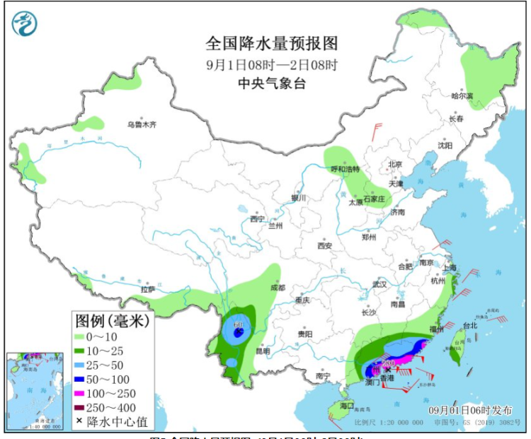 9月2日08时至3日08时,广东中西部、广西东部、福建东北部、浙江东部、台湾岛大部等地有大到暴雨,其中,广东西南部、台湾岛中北部等地部分地区有大暴雨,广东西南部等地局地特大暴雨(250~280毫米)(见图6)。大风预报信息请参见中央气象台最新一期《海洋天气公报》。