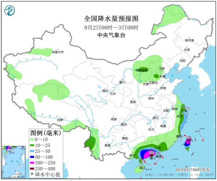 图6 全国降水量预报图(9月2日08时-3日08时)