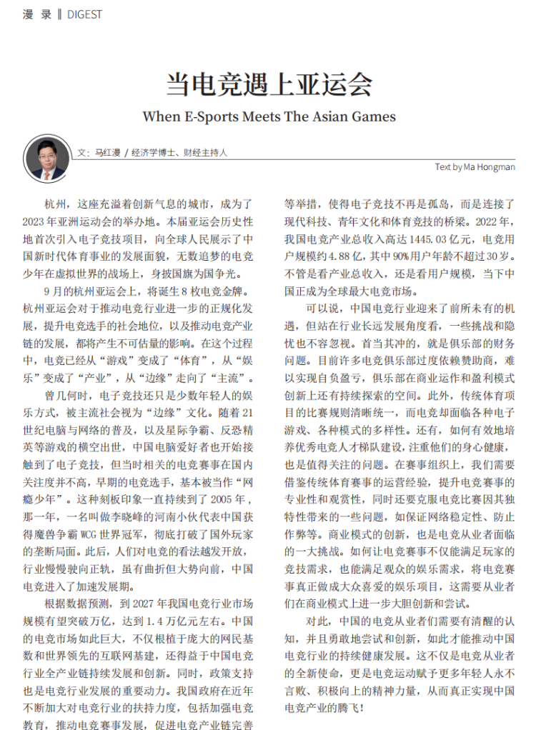 杭州亚运会新增的电子竞技正式比赛项目,也是吸引年轻人注意力的密钥。在这个时间节点回望北京亚运会,同时展望即将开幕的杭州亚运会,我们期待这届更年轻、更开放的杭州亚运会,会创造难忘的记忆。