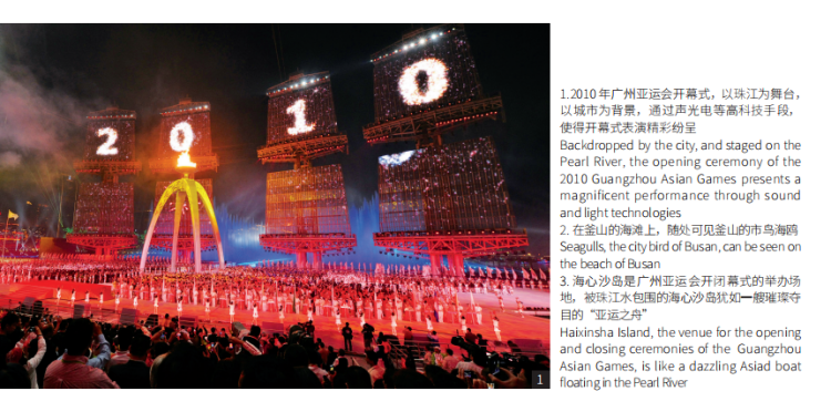 在北京亚运会和杭州亚运会之间,是2010年在广州海心沙广场举办的亚运会,这也是亚运会历史上第一次在体育馆之外的地方举办开闭幕式。亚运会历史上,在首都之后第二个举办亚运会的城市,除了中国广州,还有韩国的釜山。2002 年,时隔汉城亚运会十六年之后,釜山举办了第十四届亚运会。它的地理特征和广州有相似之处,也被山、江、海围绕。广州、釜山,这两座依水而兴的城市因亚运更精彩。