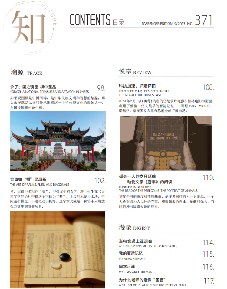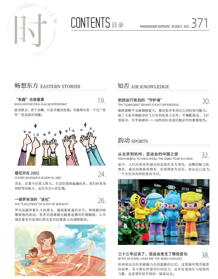 即将于9月开幕的杭州亚运会、航班运行背后默默工作的“守护者”、领略城市文化的Citywalk……9月刊的《东方航空》陪伴你在秋高气爽的凉风中感受世界的脉搏。