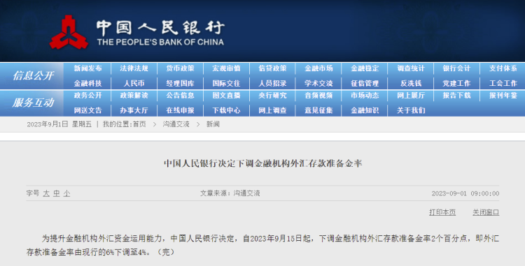 央行宣布9月15日起下调金融机构外汇存款准备金率2个百分点,离岸人民币闻声而涨 周到君 2023-9-01 来源:周到上海 央行官网今早消息,为提升金融机构外汇资金运用能力,中国人民银行决定,自2023年9月15日起,下调金融机构外汇存款准备金率2个百分点,即外汇存款准备金率由现行的6%下调至4%。 中国人民银行官网截图 受此消息影响,离岸人民币一度短线急速拉升350多个点。 百度股市通截图 来源:周到上海 作者:周到君 赞一个 (0)