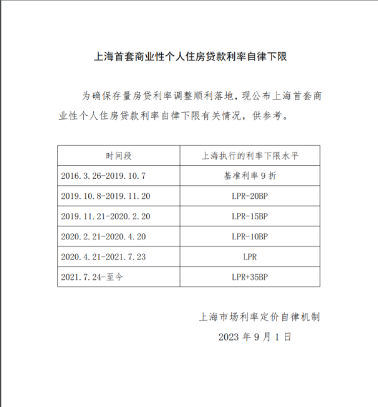 财经风向标丨上海首套商业性个人住房贷款利率自律下限公布 周到君 2023-9-01 来源:周到上海 9月1日,央行上海总部网站发布《上海首套商业性个人住房贷款利率自律下限》。 来源:周到上海 作者:周到君 赞一个 (0)
