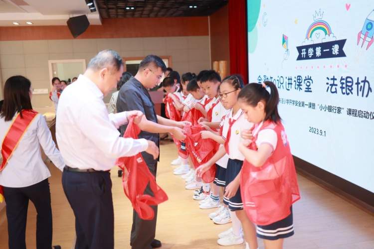 活动最后,干勤欢校长宣布“小小银行家”课程进校园活动正式启动。吴舟行长、吴瑕副镇长、陈宝勇庭长为暑期里参加银校共建实践活动的第一批“小小银行家”穿上马甲,期待接下来的课程里带领身边小伙伴一起学习、成长。