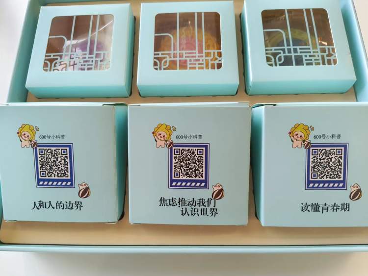 值得一提的是,今年的月饼盒子背后,还印有心理科普,扫描二维码即可听到“600号小科普”,一边吃月饼,一边了解心理知识解压。