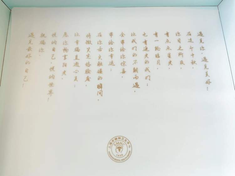 打开盒子,是来自上海市精神卫生中心的“中秋寄语”:遇见你,遇见美好,在这个中秋……愿你悦纳自己,悦纳世界!祝福你,遇见最好的自己!