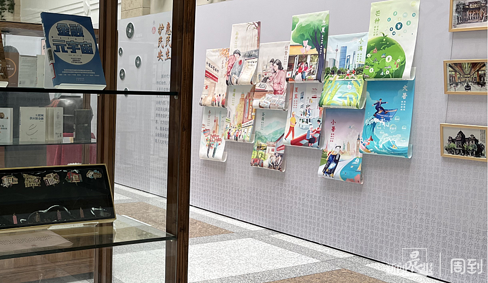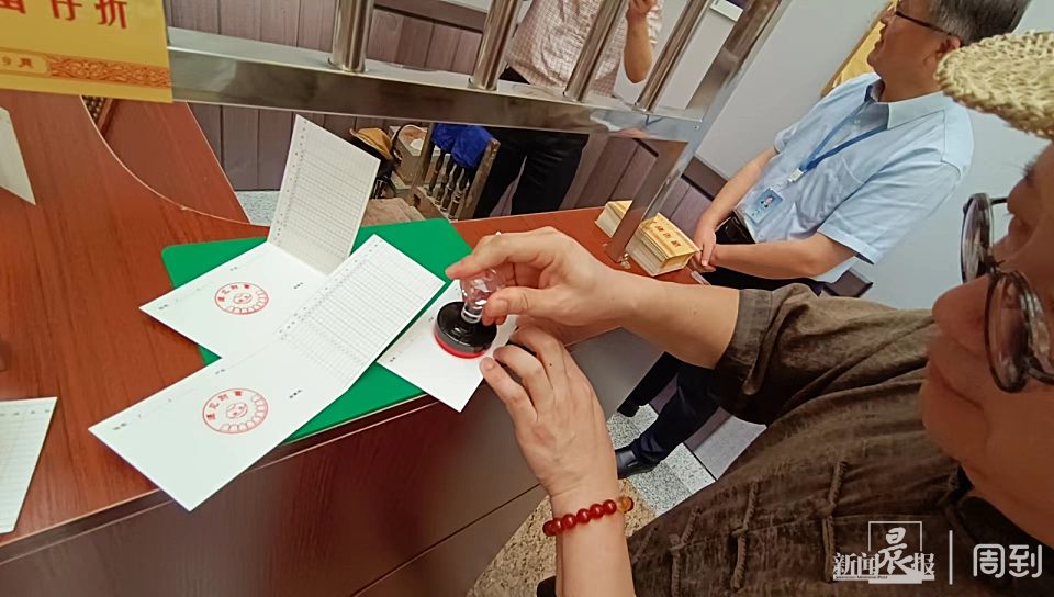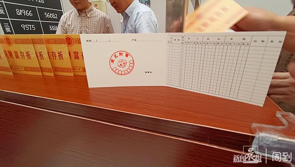 除了拍照打卡,观众还可以在现场领取一份复古存折式样的“遇见财富”展览参观折页,并现场盖章留念。在“储蓄所”柜台上,戴敦邦先生之子、画家戴红倩在展览参观折页上进行盖章并赠送给读者。