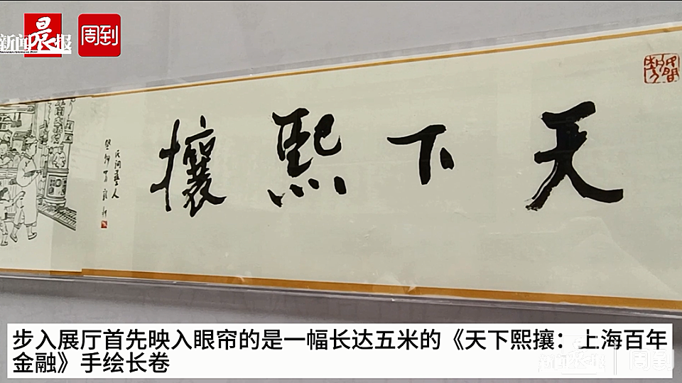 步入展厅,首先映入眼帘的是一幅长达五米的《天下熙攘:上海百年金融》手绘长卷。该作品由上海市银行博物馆馆长黄沂海创作,海派书画家戴敦邦题签,首次公开展出。作品以白描的手法,描摹了近代上海金融业百态。