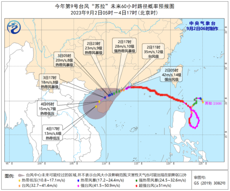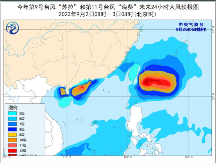 预计今明两天,“苏拉”将以每小时10-15公里的速度向西偏南方向移动,强度逐渐减弱,并向雷州半岛东部近海靠近。未来24小时,广东西南部、广西东南部、香港、澳门以及云南西部、台湾岛东部等地部分地区有大到暴雨,其中,广东西南部部分地区有大暴雨;南海西北部、北部湾东部、琼州海峡及广东沿海、广西南部沿海、珠江口以及香港和澳门等地将有7-9级、阵风10-11级的大风,“苏拉”中心经过的附近海面或地区风力有12-13级、阵风14-15级。