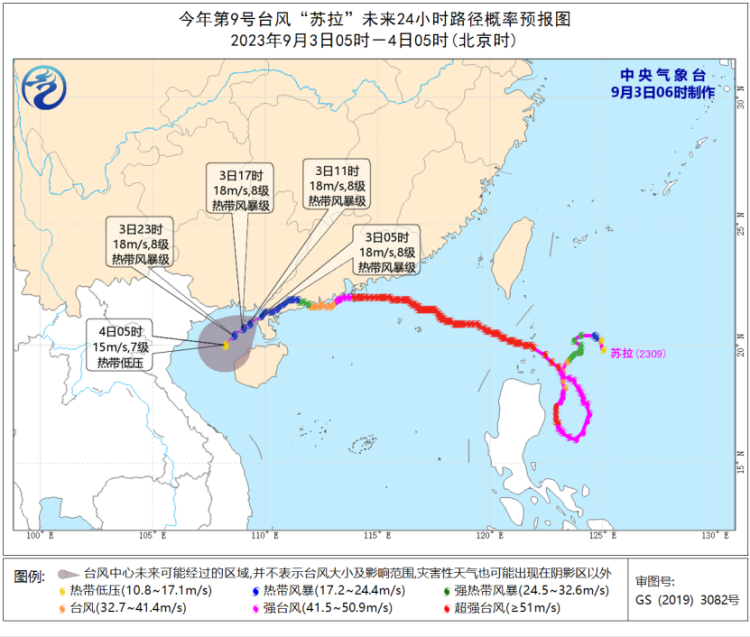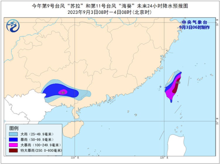 降水预报:9月3日08时至4日08时,受“苏拉”和“海葵”影响,广西中南部、广东西南部、台湾岛等地部分地区有大到暴雨,其中,广西中南部、台湾岛中东部等地部分地区有大暴雨,台湾岛东部部分地区有特大暴雨(250-600毫米)。