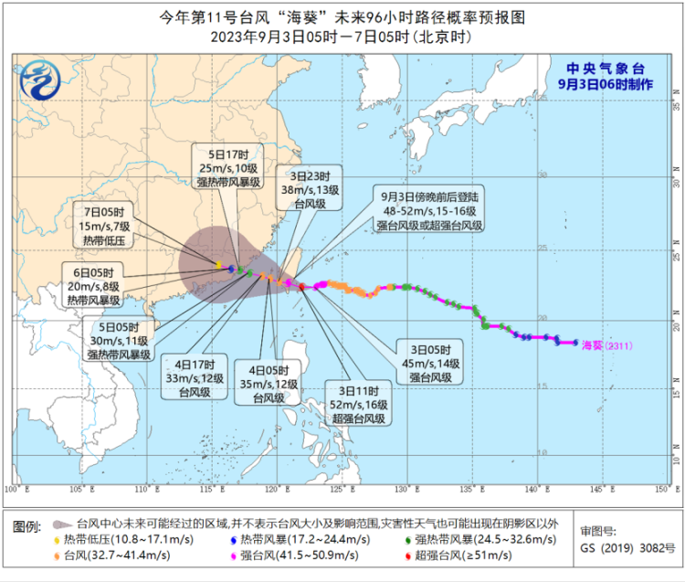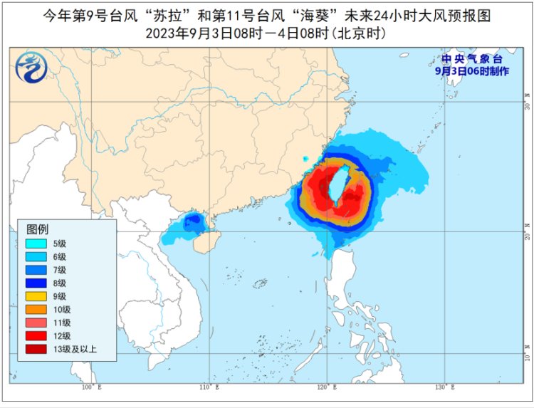 大风预报:9月3日08时至4日08时,受“苏拉”影响,北部湾、琼州海峡以及广西南部沿海、海南岛北部沿海等地将有6-7级大风,其中北部湾部分海域将有8级、阵风9-10级的大风;受“海葵”影响,巴士海峡、台湾海峡、台湾以东洋面、东海南部及钓鱼岛附近海域以及浙江南部沿海、福建沿海、台湾岛沿海将有6-8级、阵风9-10级大风,部分海域或地区的风力有9-12级,阵风13-14级,“海葵”中心经过的附近海面或地区的风力有13-16级,阵风17级。