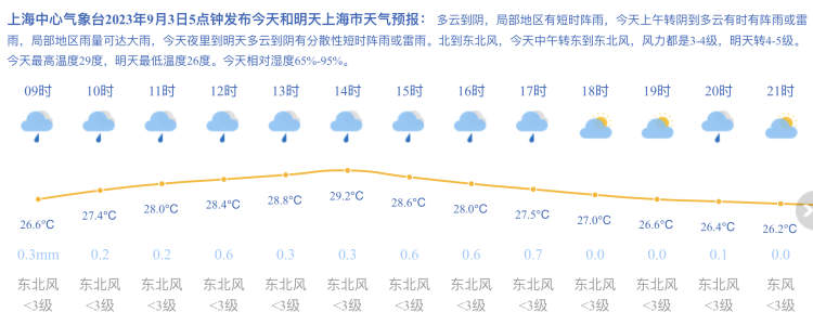 上海今天早晨多云到阴,局部地区有短时阵雨,今天上午转阴到多云有时有阵雨或雷雨,局部地区雨量可达大雨。北到东北风,今天中午转东到东北风,风力都是3-4级。今天最高温度29℃,最低温度26℃。今天相对湿度65%-95%。