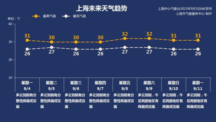 下周,本市受海上偏东气流影响,云系较多,伴有分散性降水,气温较平稳,几乎要走成两条平行线,最低26-27℃,最高30℃出头,早晚较舒适,午间有些热意。