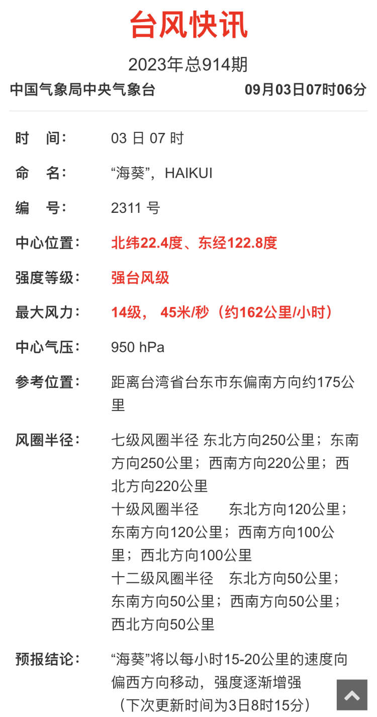 今年第11号台风“海葵”已于昨天(9月2日)夜间由台风级加强为强台风级,今晨(3日)5时其中心位于台湾省台东市东偏南方向约185公里的海面上,中心附近最大风力有14级(45米/秒)。预计“海葵”将以每小时15-20公里的速度向偏西方向移动,强度还将有所增强,最强可达超强台风级(52-55米/秒, 16级)。
