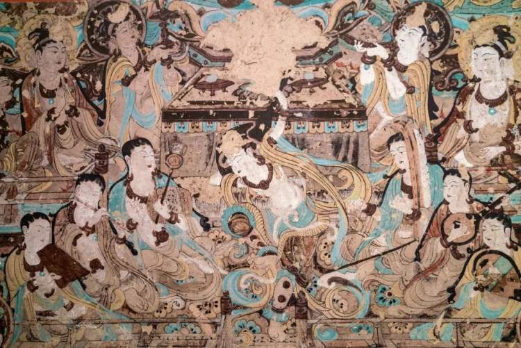 从震撼中走出,我依次参观了八个洞窟。从北魏到隋朝,从唐朝到西夏,我发现每个时期的壁画底色都不一样,越到盛世越鲜亮,装饰也越来越多。因为颜料含铅较多,经过时间的沉淀,人物的面孔和一些装饰都氧化变黑,有的泥塑还贴有残缺的金箔,要在当时可是金碧辉煌,闪闪发光啊!