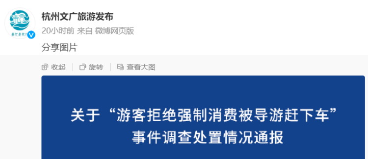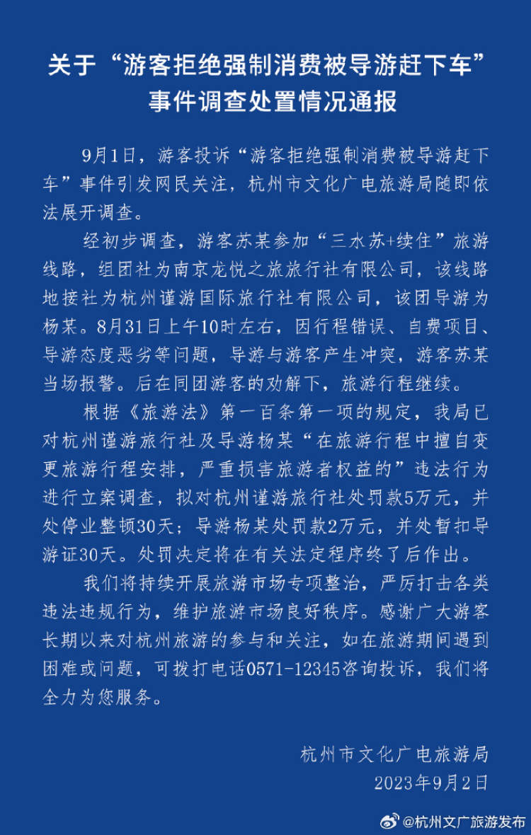 9月1日,游客投诉“游客拒绝强制消费被导游赶下车”事件引发网民关注,杭州市文化广电旅游局随即依法展开调查。9月2日,杭州市文化广电旅游局通报关于“游客拒绝强制消费被导游赶下车”事件调查处置情况。