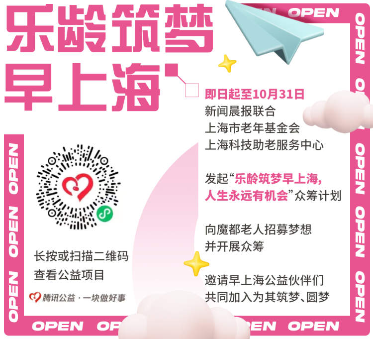 9月4日至11日是上海慈善周,在这个节点上,新闻晨报·周到联合上海市老年基金会、上海科技助老服务中心,发起“乐龄筑梦早上海,人生永远有机会”众筹计划。即日起至10月31日,向魔都老人招募梦想并开展众筹,邀请早上海公益伙伴们共同加入,为其筑梦、圆梦。