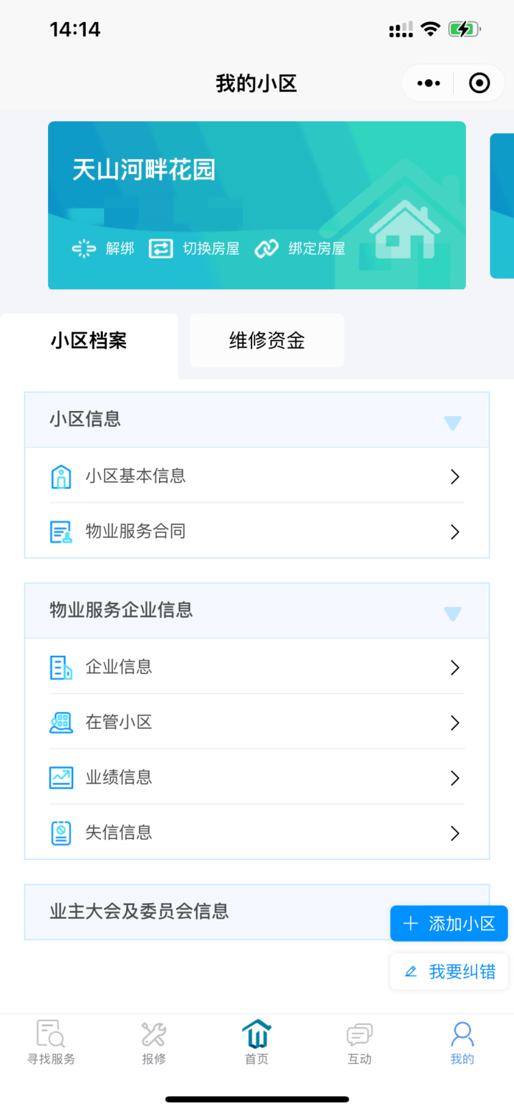 小区档案优化,公众号中我的房屋-小区信息,升级至从小程序【我的】中,卡片式查询小区档案、维修资金等信息,使查询更便捷。