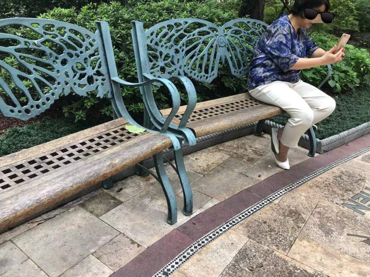 高安花园的蓝色蝴蝶椅有点高,大部分人靠背后脚尖踮地