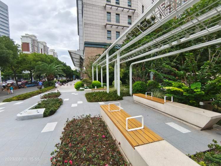 衡山路、吴兴路口的丽波·水漾口袋公园里,结合花坛边缘改造而成的几把椅子也略高,椅面离地51厘米左右,估摸如果屁股坐满整个椅面,身高至少160厘米以上,双脚才能完全着地。