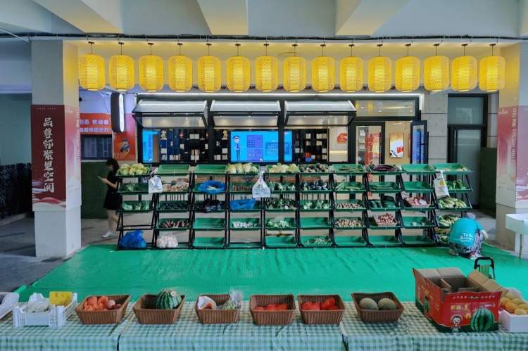 经过一段时间的规范化运营,菜品质量和种类把控得到了提升,也实现了菜品的明码标价,便民菜场版本升级到了3.0。但是也收到了新的居民反馈:“桥洞下环境昏暗,一到阴雨天光线就很差”。在共建单位的助力下,菜场内免费安装了光带,还与“邻聚里”空间相结合,借助电子屏宣传时政、反诈和反腐等公益信息,最终形成了当下的便民菜场4.0——菜场更“智慧”,居民体验感更好。