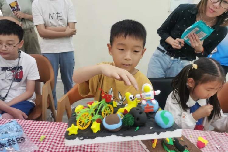 就这样,孩子们围坐在一起,摩拳擦掌准备“开工”,想将自己脑海中的专属停车场一点点实现。他们铺“地基”、种“草地”、团“星球”,每个孩子都忙得不亦乐乎。