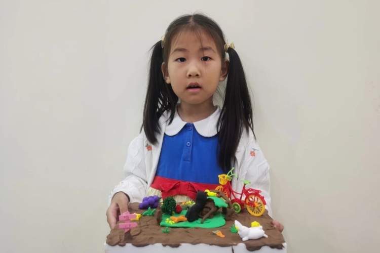 “我设计的是‘小花小草停车场’,在我的停车场上有小兔子、小猫咪和小鸭子,它们都是我喜欢的动物。我还给我的停车场做了仙人掌、小草和葡萄,还有星星灯会在晚上的时候亮。”
