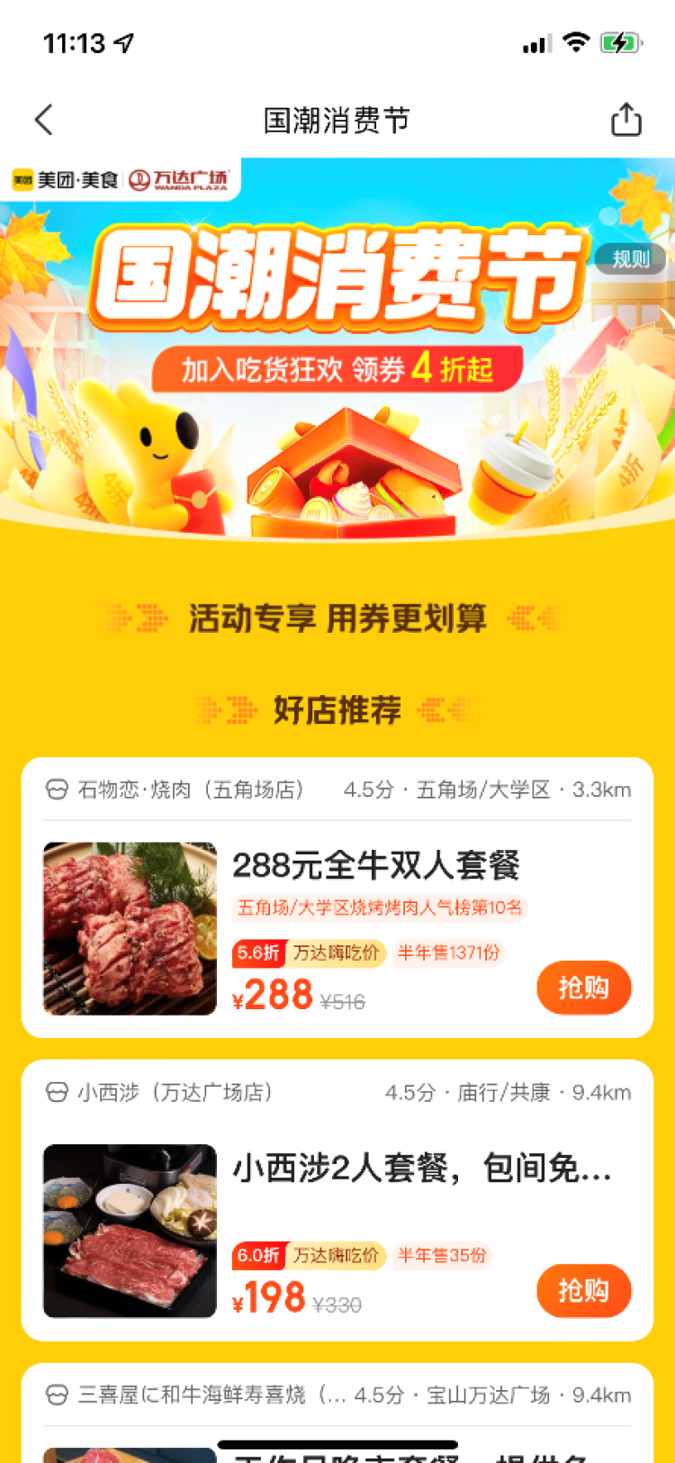 大众点评面向全国推出“十一逛吃节”主题活动,活动联合有影响力的优质品牌商户,推出大牌特色供给,发放上千万优惠券补贴,更有邀请有奖、评价激励、笔记创作等多样玩法。“十一逛吃节”,跟着点评边吃边玩,吃的对,旅行才完美!美团外卖推出“每日大咖”、“超级567”等上海市民专属的主题活动,每天抢6元咖啡神券,大牌咖啡天天买1送1。更有20元大额神券周周抢,限时星巴克买一送一,肯德基、麦当劳等大牌低至5折起!