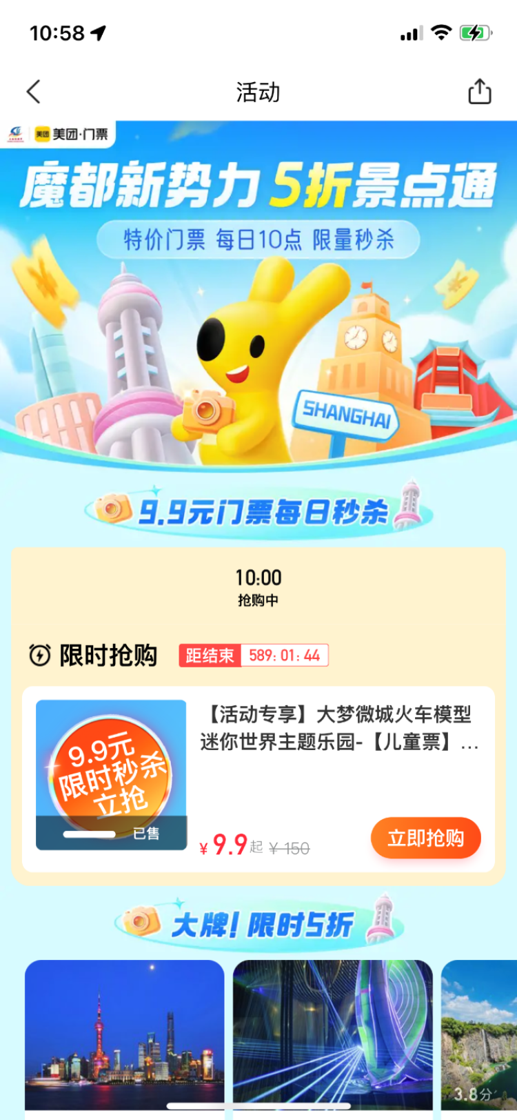 今年上海购物季期间,美团门票面向全国消费者启动景区门票大促,预售门票提前囤、3折起,可随时退、过期退,还可抽66元旅游提前订红包,活动涵盖上海迪士尼、玛雅水上乐园、上海野生动物园等热门景区。千古情景区超值特惠限时抢,各类门票低至5折起,成人票159元起,亲子票269元起!美团门票还推出专题促销活动“魔都新势力 5折景点通”,联合东方明珠广播电视塔、上海之巅观光厅、世博会博物馆等沪上标志性景区景点,特价门票限量秒杀、低至9.9元,大牌景区限时5折,帮助用户省钱出游。