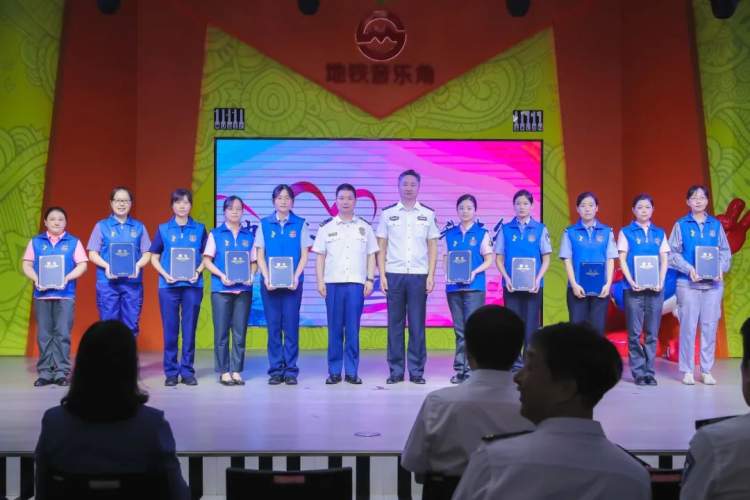 ▲市消防救援总队成新兴专员、市公安局城市轨道和公交总队徐文斌副总队长为志愿者代表颁发证书