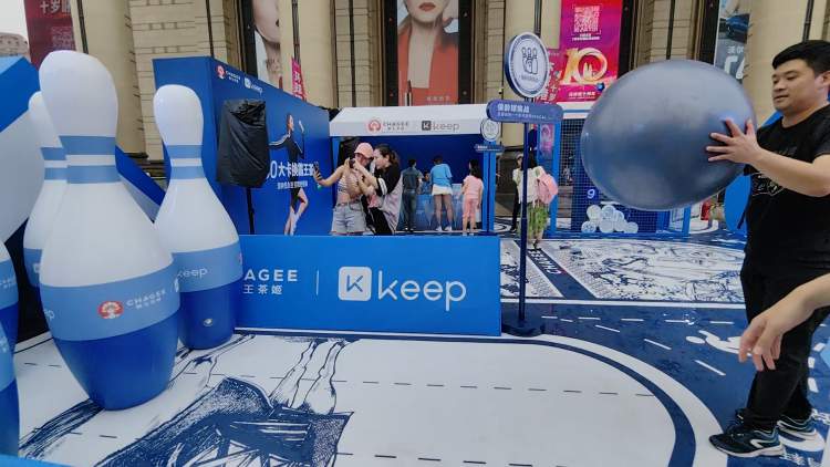 记者在环球港南广场看到,霸王茶姬×KEEP联名展颇有意思,骑健身自行车、打巨型保龄球等运动过后,能获得30或50卡路里的卡片,集齐100卡路里,就能兑换一杯霸王茶姬。