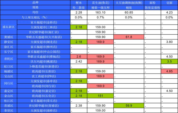 ■粉底标注代表该粮油品种在上述超市的最高价;绿底标注代表该粮油品种在上述超市的最低价