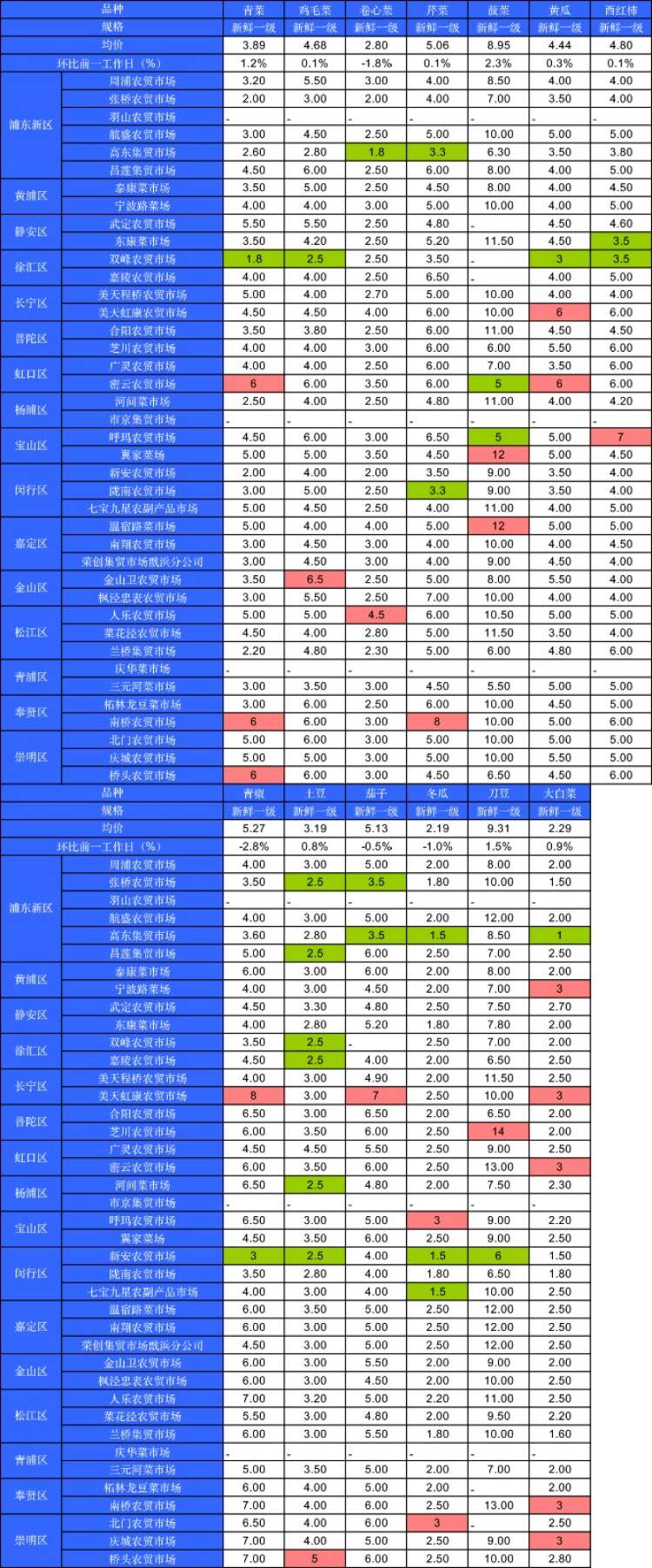 ■粉底标注代表该蔬菜品种在上述农贸市场或超市的最高价;绿底标注代表该蔬菜品种在上述农贸市场或超市的最低价