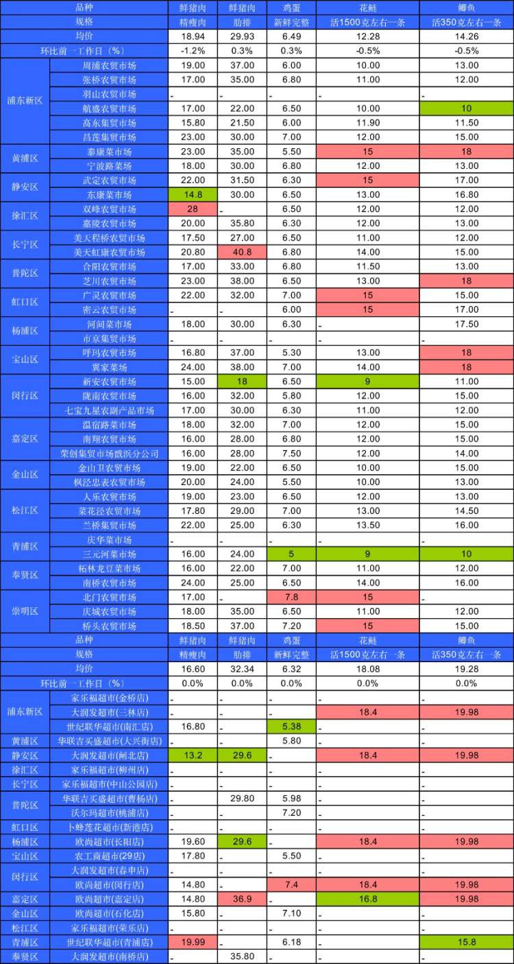 ■粉底标注代表该肉蛋鱼品种在上述农贸市场或超市的最高价;绿底标注代表该肉蛋鱼品种在上述农贸市场或超市的最低价