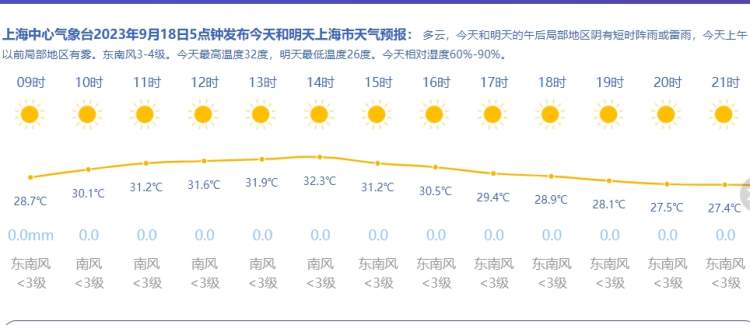 申城今天处在副高边缘,多云天气为主,今天午后要注意提防局部短时阵雨或雷雨。今天气温继续攀升,预计最高可达32℃,虽然还算不上“秋老虎”,不过风小、湿度大,午间体感仍会显得闷热。