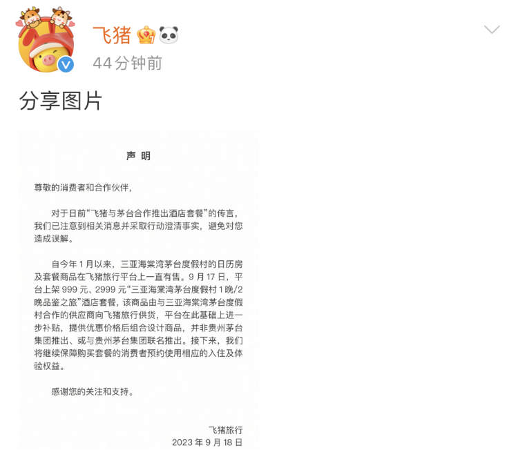自今年1月以来,三亚海棠湾茅台度假村的日历房及套餐商品在飞猪旅行平台上一直有售。9月17日,平台上架999元、2999元“三亚海棠湾茅台度假村1晚/2晚品鉴之旅”酒店套餐,该商品由与三亚海棠湾茅台度假村合作的供应商向飞猪旅行供货,平台在此基础上进一步补贴,提供优惠价格后组合设计商品,并非贵州茅台集团推出、或与贵州茅台集团联名推出。接下来,我们将继续保障购买套餐的消费者预约使用相应的入住及体验权益。