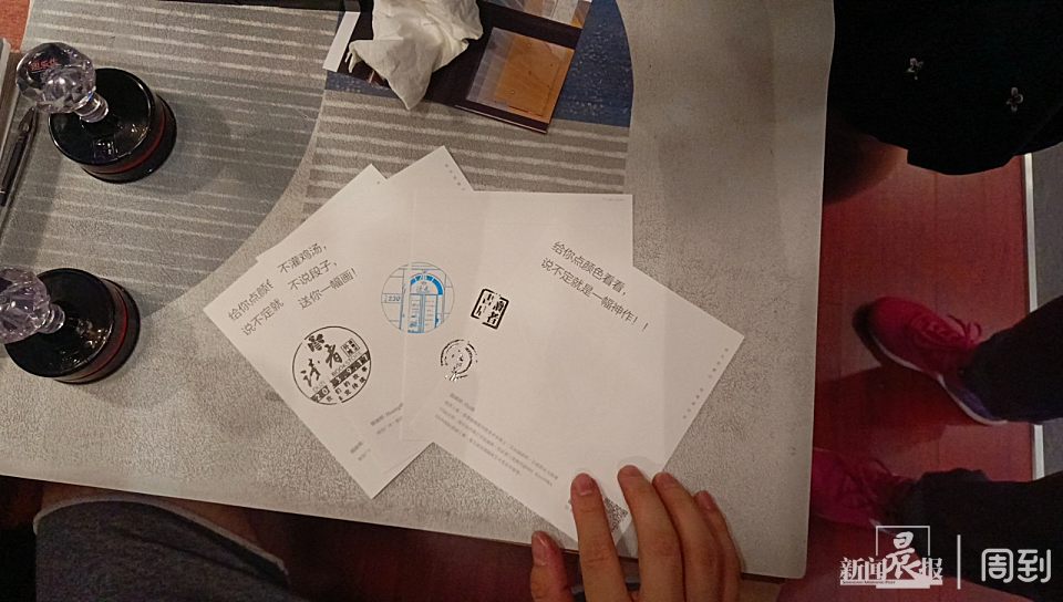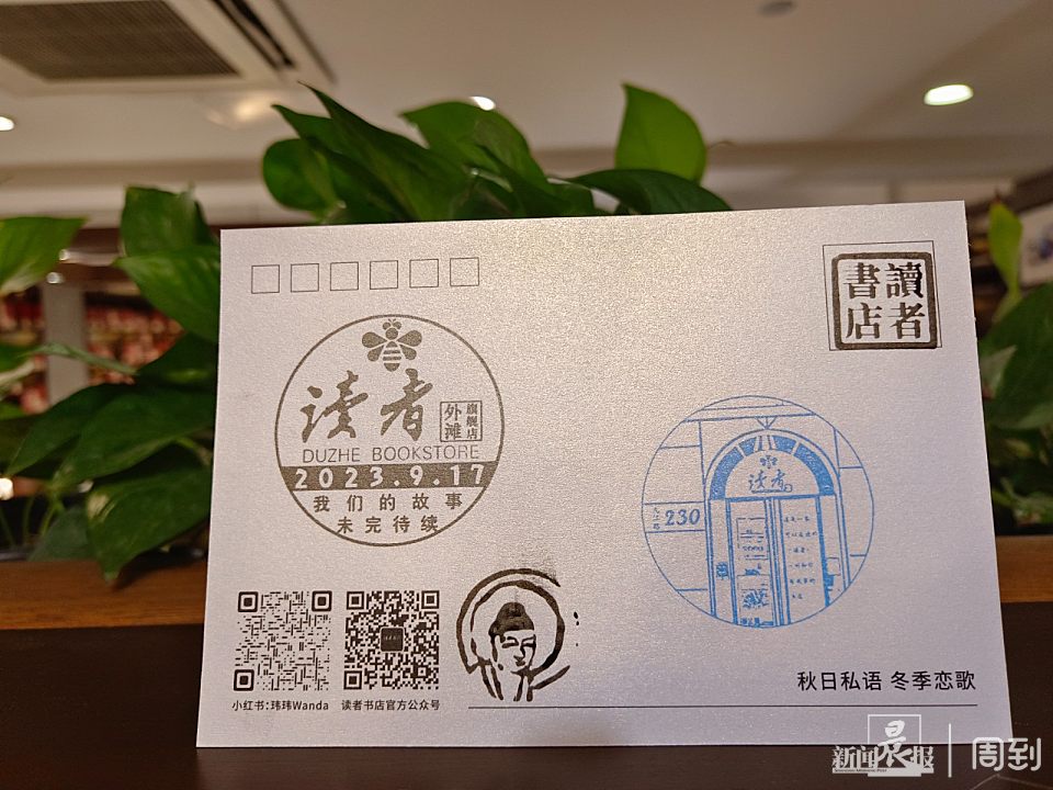 书店在9月17日当天提供准备了一系列闭店纪念品,包括外滩读者书店风景明信片一套、敲章本和纪念章,不少读者拿着笔记本、卡纸或敲章本,让工作人员敲上纪念章。记者注意到,明信片上的那枚特制纪念章让人回味“我们的故事,未完待续”。
