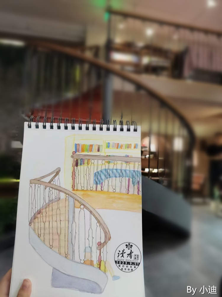 我们觉得书店挺漂亮的,想把它的美记录下来。自己找喜欢的场景和角度画,遇到不知道怎么表达就问资深画友,画友会主动帮助小白,画完大家会互相看画,看每个人不同的表达方式。有的画友喜欢画人物,有读者走进书店了,他觉得这个读者有意思,他就开始画,有时候没画完读者走了,就根据脑补画完。有的大神自带“鱼眼”透视,从一个点开始画,不用橡皮,一直画到铺满画面。