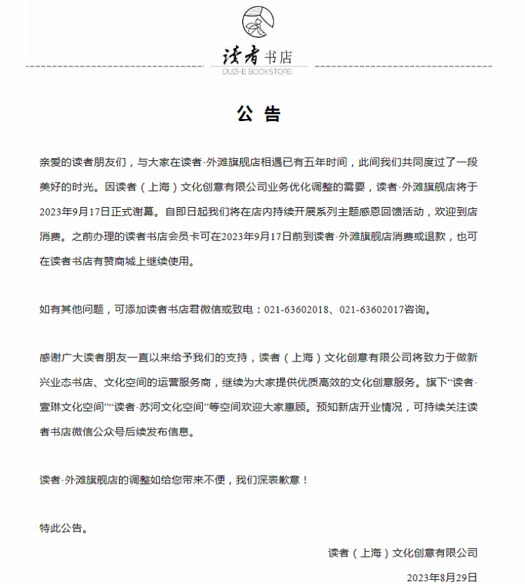 8月29日晚上,读者(上海)文化创意有限公司(以下简称读者上海公司)发布公告,在公告当中,读者上海公司表示,因公司业务优化调整的需要,读者外滩旗舰店将于2023年9月17日正式谢幕。