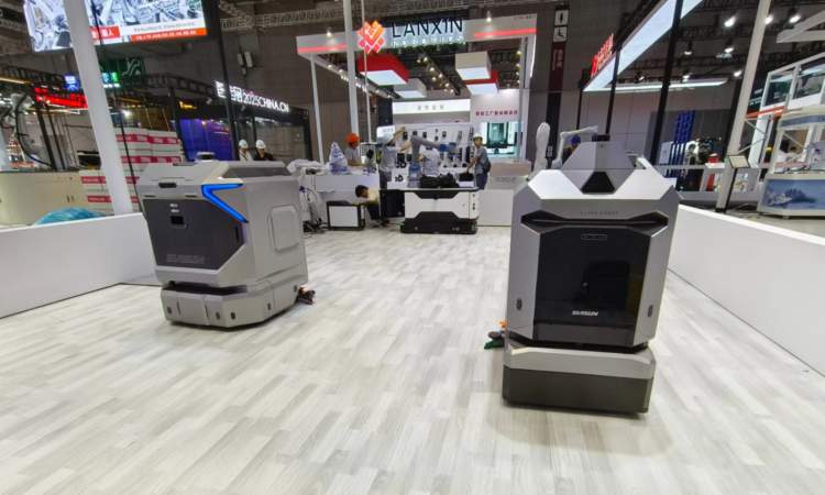 在新松机器人展台上,工业清洁机器人在划定的范围内不断进行清洁工作。工作人员介绍,这款工业清洁机器人可以和很多智能设备实现融合作业,提升清洁和生产效率。