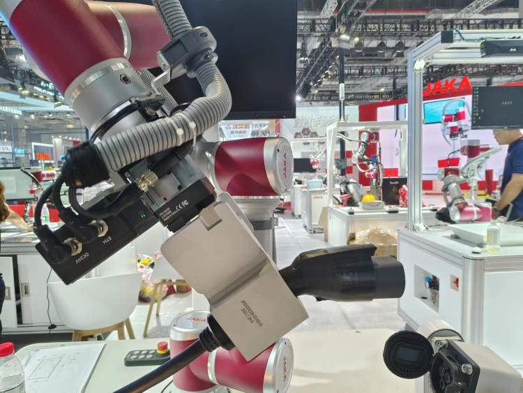 这款新能源车充电机器人搭载在搬运机器人上,感应到车子停好后,就会自动过来取下充电枪,插入充电接口进行充电。节卡机器人与3D相机进行‘手眼’配合,可准确识别规划路径,自动完成电动汽车插拔充电过程,带来智能化车辆充电体验。”