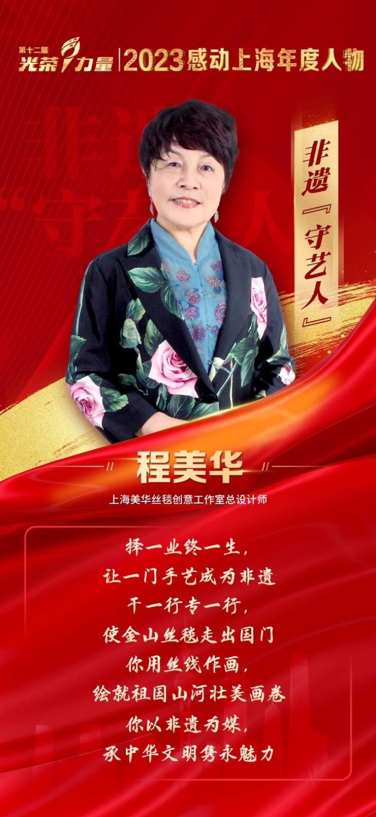 8.程美华,女,汉族,1954年10月出生,中共党员,上海美华丝毯创意工作室总设计师。50年前入行丝毯编织,凭借勤劳与天分成为技术骨干,挑起了传承创新的大梁。在新技术、新工艺、新材料、新设计上不断突破,艺术风格在国际舞台上独树一帜,作品被联合国儿童基金会、中国国家博物馆、中共一大纪念馆、上海世博会、美国国家艺术博物馆等重要馆会收藏、陈列,将金山丝毯打造成闪亮的中华优秀传统文化名片。2016年,“金山丝毯织造技艺”入选上海市非物质文化遗产保护项目,她成为市级非遗传承人。曾获全国三八红旗手、上海工匠、上海市五一劳动奖章等。