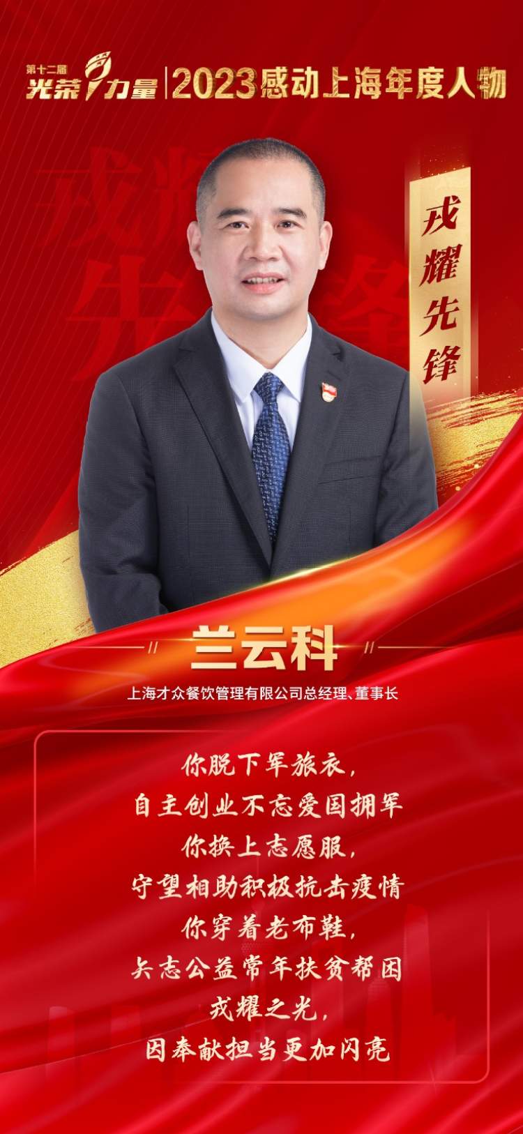 7.兰云科,男,畲族,1973年9月出生,中共党员,上海才众餐饮管理有限公司总经理、董事长。他积极开展慈善公益活动,坚持扶志助学,设立“兰云科专项奖学金”,坚持结对帮困,结对革命老区伤残退役军人,累计捐赠资金3760多万元,坚持拥军优属,安排就业岗位4200多人。武汉疫情时,捐款500多万元人民币和防疫物资,并带领7名退役军人志愿者进驻金银潭医院和火神山医院,坚守87天。2022年上海疫情严峻时,他组织以退役军人为主体的志愿者队伍共计3600余人次参加志愿活动。曾获“全国最美志愿者”、全国学雷锋先进个人、全国退役军人创业模范等。