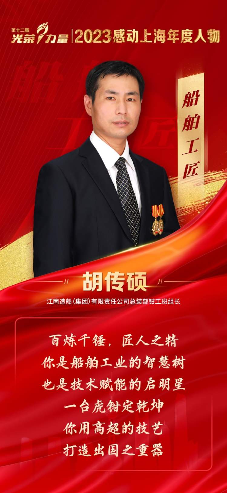 5.胡传硕,男,汉族,1983年10月出生,中共党员,江南造船(集团)有限责任公司总装班组长。他凭借对工作锲而不舍、精益求精的精神,成长为国内船舶制造业领域卓越的钳工技能带头人,先后参与建造了多型国家重点战略高新产品及重点工程项目,完成了“远望”号航天测量系列船、大型液化气船、自卸船、化学品船等高技术含量、高附加值船舶产品的建造工作。他自主研制的16项船舶专用工装中,有3项获得国家专利,通过多种独创工艺,填补技术领域空白,作出突出贡献。曾获全国五一劳动奖章、全国技术能手、上海市劳动模范等。