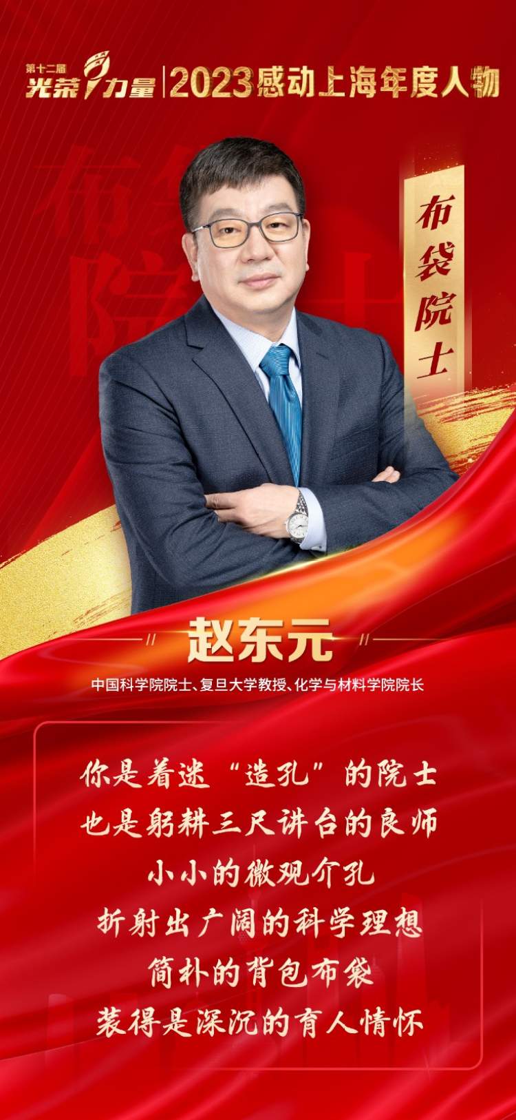 1.赵东元,男,汉族,1963年6月出生,中共党员,中国科学院院士、复旦大学教授、化学与材料学院院长。他长期从事化学基础理论和化学应用领域的研究,带领团队发明了20余种以复旦大学命名的介孔材料,荣获多个国内外重量级学术奖项,研究成果也转化催生出了介孔碳超级电容器、钯介孔碳催化剂、铜锰介孔碳催化剂等产品,利用于北京奥运村、上海世博会等场景。科研之外,他坚持为本科生讲授专业基础课《普通化学》,培育青年研究人才,从教30余年来,以立德树人为根本原则,坚持因材施教和创新求实,桃李遍天下。曾获全国创新争先奖章、国家自然科学一等奖、上海市科技功臣奖等。