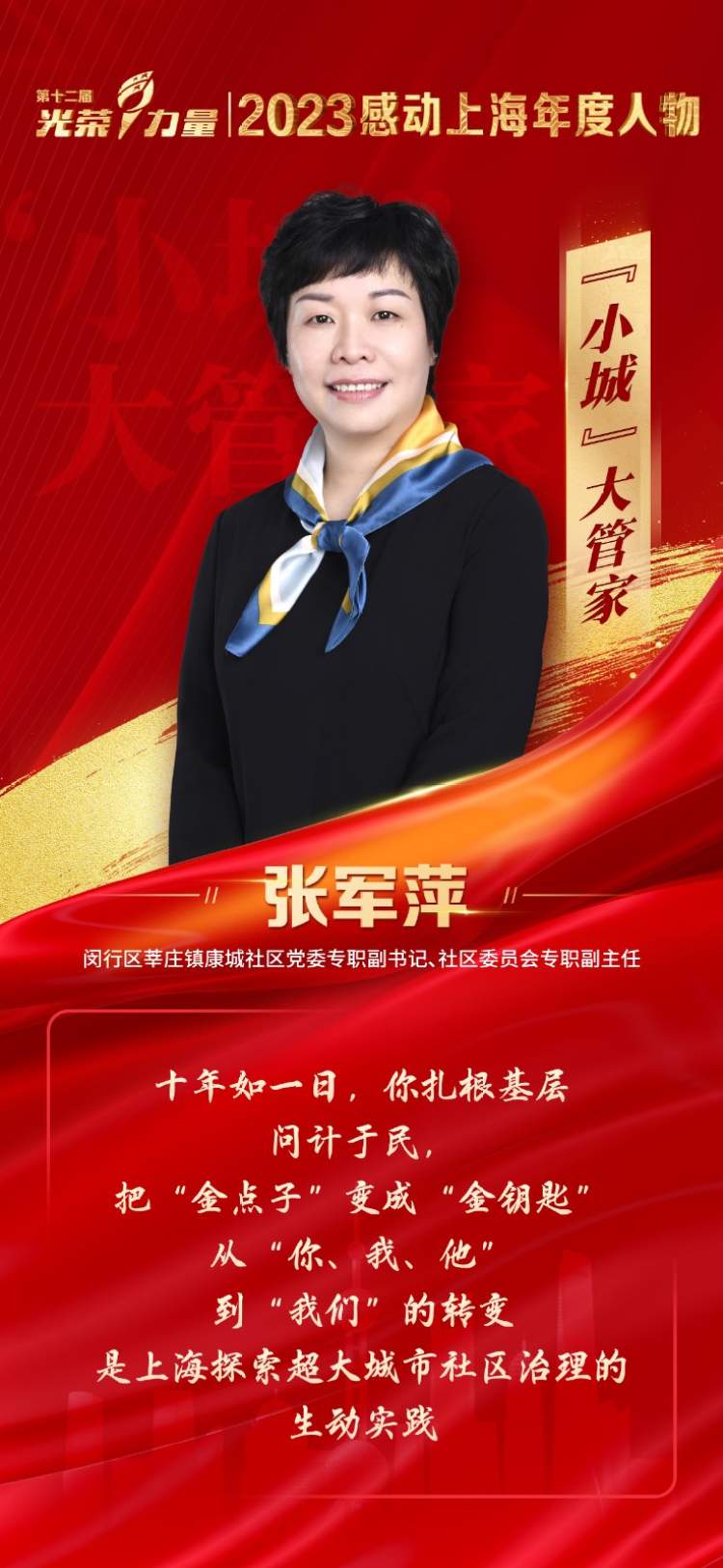 6.张军萍,女,汉族,1977年12月出生,中共党员,闵行区莘庄镇康城社区党委专职副书记、社区委员会专职副主任,党的二十大代表。她身为上海最大的四万人开放式社区——上海康城的“大管家”,10年时间里用“绣花针”精神将社区治理做精做细。发挥“桥梁纽带”作用,听民声、解民忧、集民智,引导广大居民共同参与社区治理,成为美好社区“合伙人”“当家人”。疫情期间冲锋一线,组织2600余名志愿者同心守护社区平安。不断探索超大型社区管理的有效路径,为建设人人有责、人人尽责、人人享有的社会治理共同体贡献巾帼力量。曾获全国优秀共产党员、全国抗击新冠肺炎疫情先进个人、全国三八红旗手等。