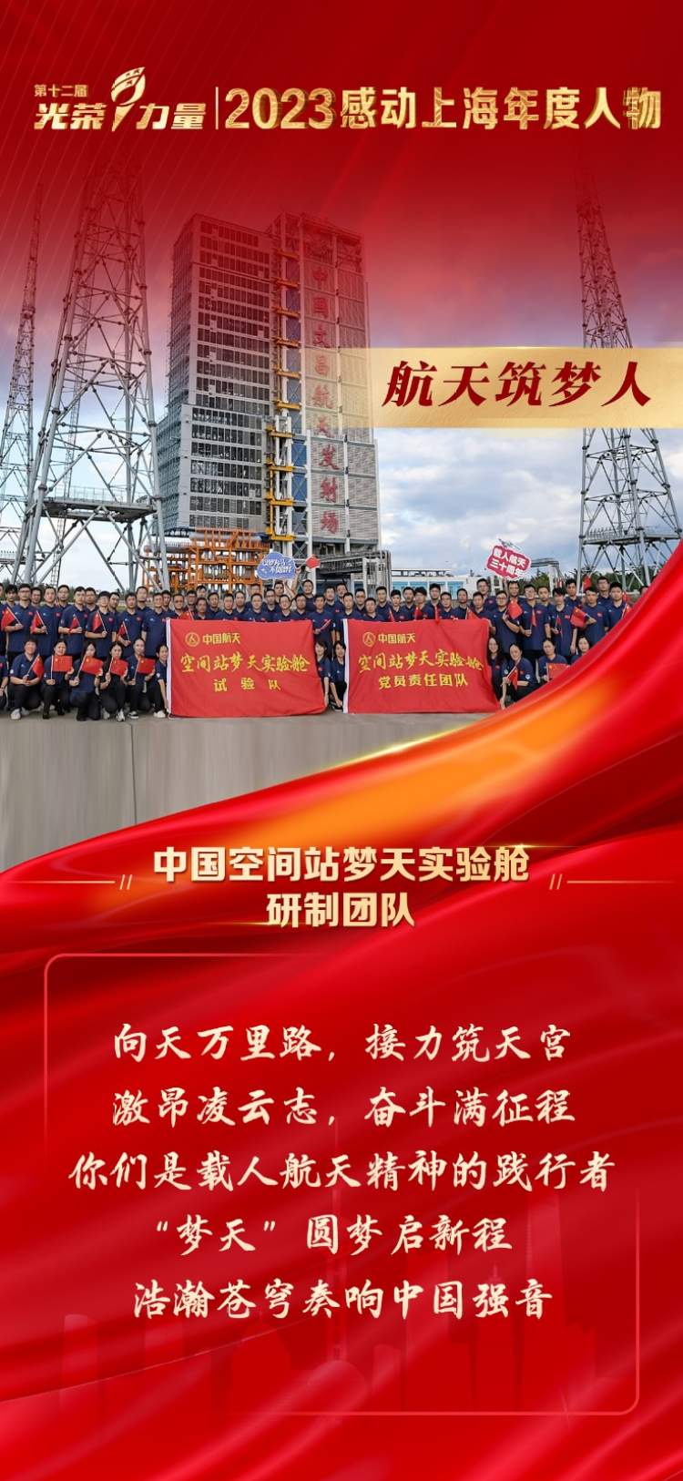 赵东元、罗利军、严兵、施德华、胡传硕、张军萍、兰云科、程美华、中国空间站梦天实验舱研制团队、中国商飞民用飞机试飞中心试飞运行部、铁路上海站“心尚”服务工作室11个先进个人(集体)荣获“2023感动上海年度人物”称号。(简要事迹见下文)