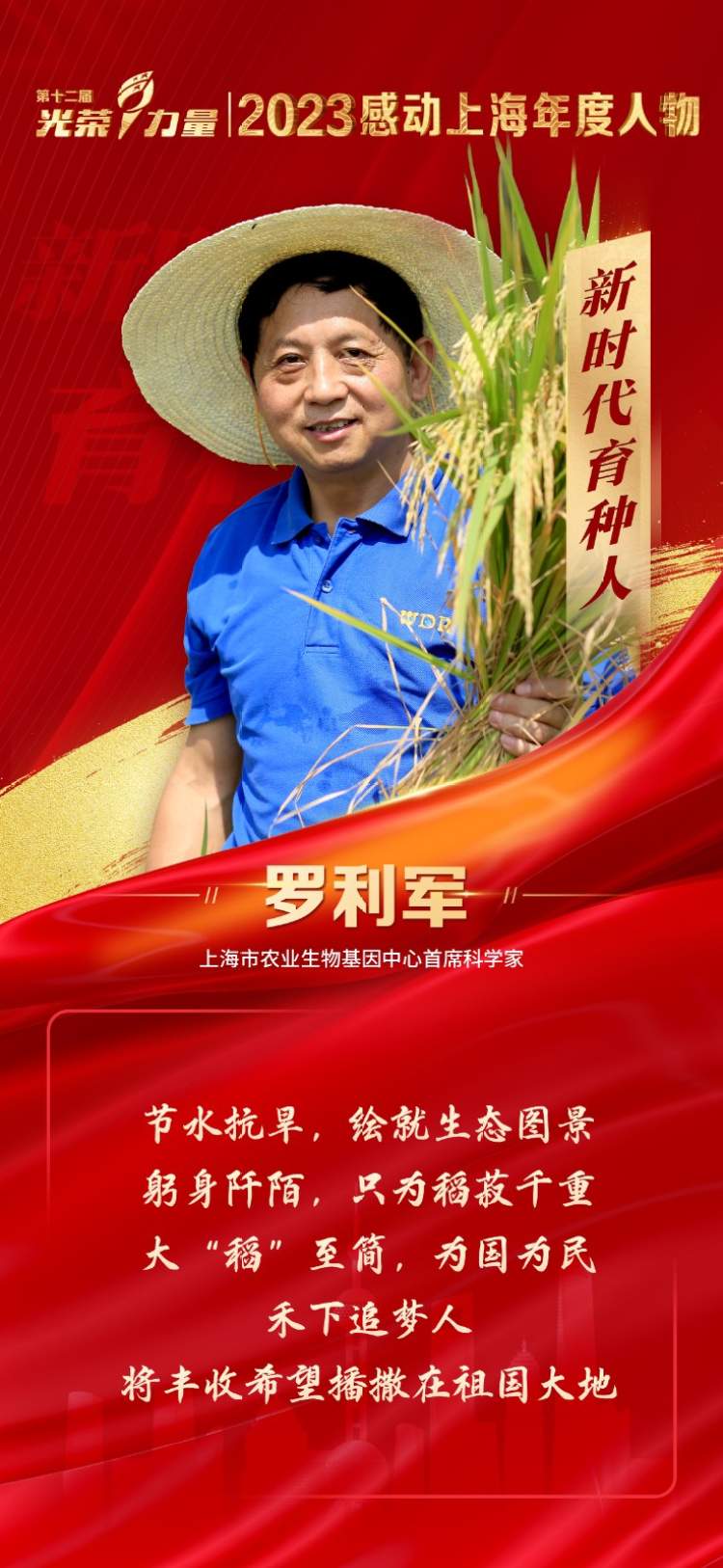 2.罗利军,男,汉族,1961年7月出生,中共党员,上海市农业生物基因中心首席科学家。他长期从事水稻遗传资源研究,创新培育了节水抗旱稻,解决了水稻高产优质与节水抗旱难以兼顾的技术难题,建立了我国水稻遗传资源保护与利用体系,发明了“双向选择”以整合抗旱性和产量的育种新技术,建立了“旱直播旱管”的绿色栽培技术体系,实现了在水田生产节水50%,减少碳排放90%以上。他积极从事科学技术普及,推广的节水抗旱稻及其配套生产技术对乡村振兴与科技扶贫发挥了重要作用。曾获全国创新争先奖状、全国杰出专业技术人才,牵头获国家科技进步一等奖1项、国家技术发明二等奖1项。